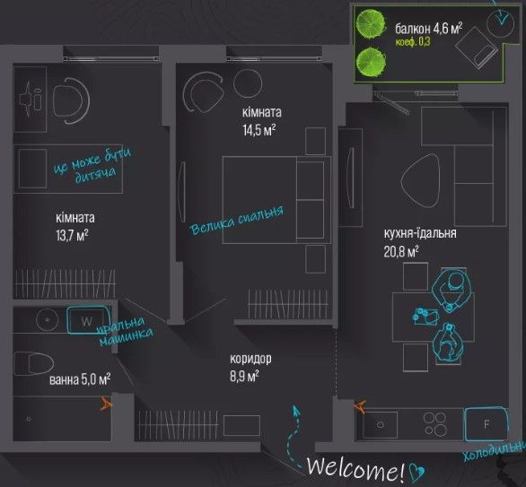 Двокімнатна квартира 64 м2