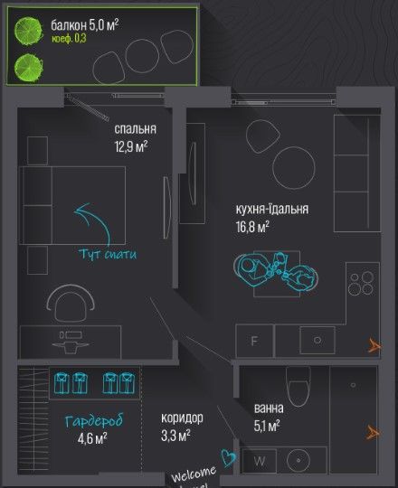 Однокімнатна квартира 44 м2