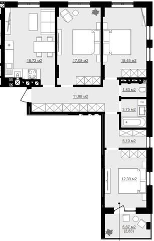 Трикімнатна квартира 89.03 м2